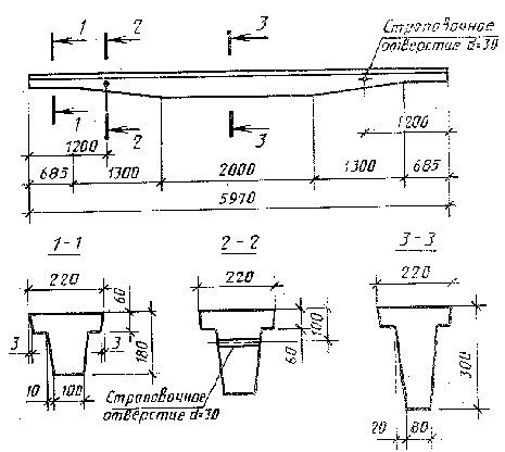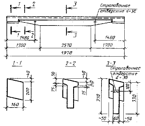 Черт. 2 1.3. Марки прогонов и их основные параметры приведены в табл. 1. 1.4. Прогоны изготовляют со строповочными отверстиями диаметром до 50 мм для подъема и монтажа прогонов с применением специальных захватных устройств. Допускается вместо строповочных отверстий предусматривать замкнутые монтажные петли треугольной формы по серии 3.400-7. 1.5. Марка прогона состоит из буквенно-цифровых групп, разделенных дефисами. Марки прогонов, приведенных в табл. 1, содержат следующие обозначения основных характеристик прогонов: - первая группа - тип прогона (п. 1.1); - вторая группа - порядковый номер прогона по несущей способности (табл. 1), а также класс напрягаемой продольной арматуры для предварительно напряженных прогонов; - третья группа - дополнительные характеристики, отражающие стойкость к воздействию агрессивной среды, характеризуемую показателем проницаемости бетона: Н - бетон нормальной проницаемости; П - бетон пониженной проницаемости. При наличии в прогонах дополнительных закладных изделий в третьей группе приводят их обозначения строчными буквами русского алфавита. Пример условного обозначения (марки) прогона типа 1ПР, третьей несущей способности: 1ПР-3 То же, типа 3ПР, пятой несущей способности, с напрягаемой продольной арматурой класса Ат-VCK, предназначенного для применения в покрытиях зданий с среднеагрессивной степенью воздействия газовой среды на железобетонные конструкции: 3ПР-5AтVCК-П